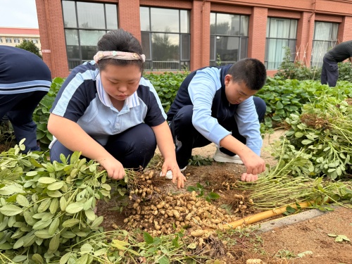 秋風(fēng)送爽,校園一角的菜園也迎來了豐收季。同學(xué)們化身“小農(nóng)夫”,興高采烈地投入大自然的懷抱。他們小心翼翼地摘下紫得發(fā)亮的茄子,摘下紅紅綠綠的辣椒,再齊心協(xié)力,將一株株花生從泥土中“揪”出來,抖落泥土,露出飽滿的果實(shí)。